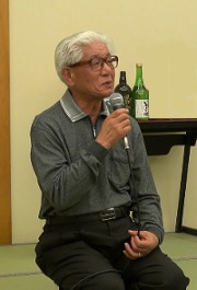 宴会では、おのおの余興を兼ねた自己紹介をしましたが、どの先生も歌がお上手なことに驚きました。東京から、シテを終えて駆けつけて下さった栗原勇晨先生は素晴らしい謡をご披露くださいました(左写真)。また、福島会から参加の降矢正美先生は、懇親会当日の午前中に撮影したという新地町の映像を上映してくださいました。同じく福島会の根本正子先生には、資料付きで福島の現状について、ご説明していただきました。